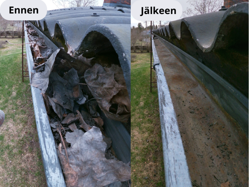 Rännejä puhdistaessa tarkistan työn jäljen kameralla varmistaakseni, että kaikki orgaaninen jäte saadaan poistettua. Työn jälkeen otan ennen ja jälkeen -kuvat tehdystä työstä, jotta asiakas voi varmistua lopputuloksesta.